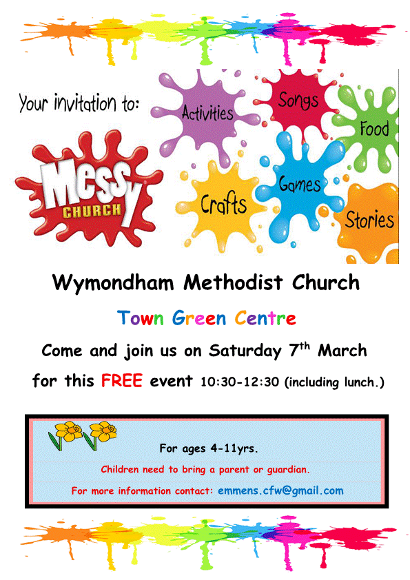 Saturday: Messy Church, bimonthly in the Town Green Centre 10.30 – 12.30 (including lunch)